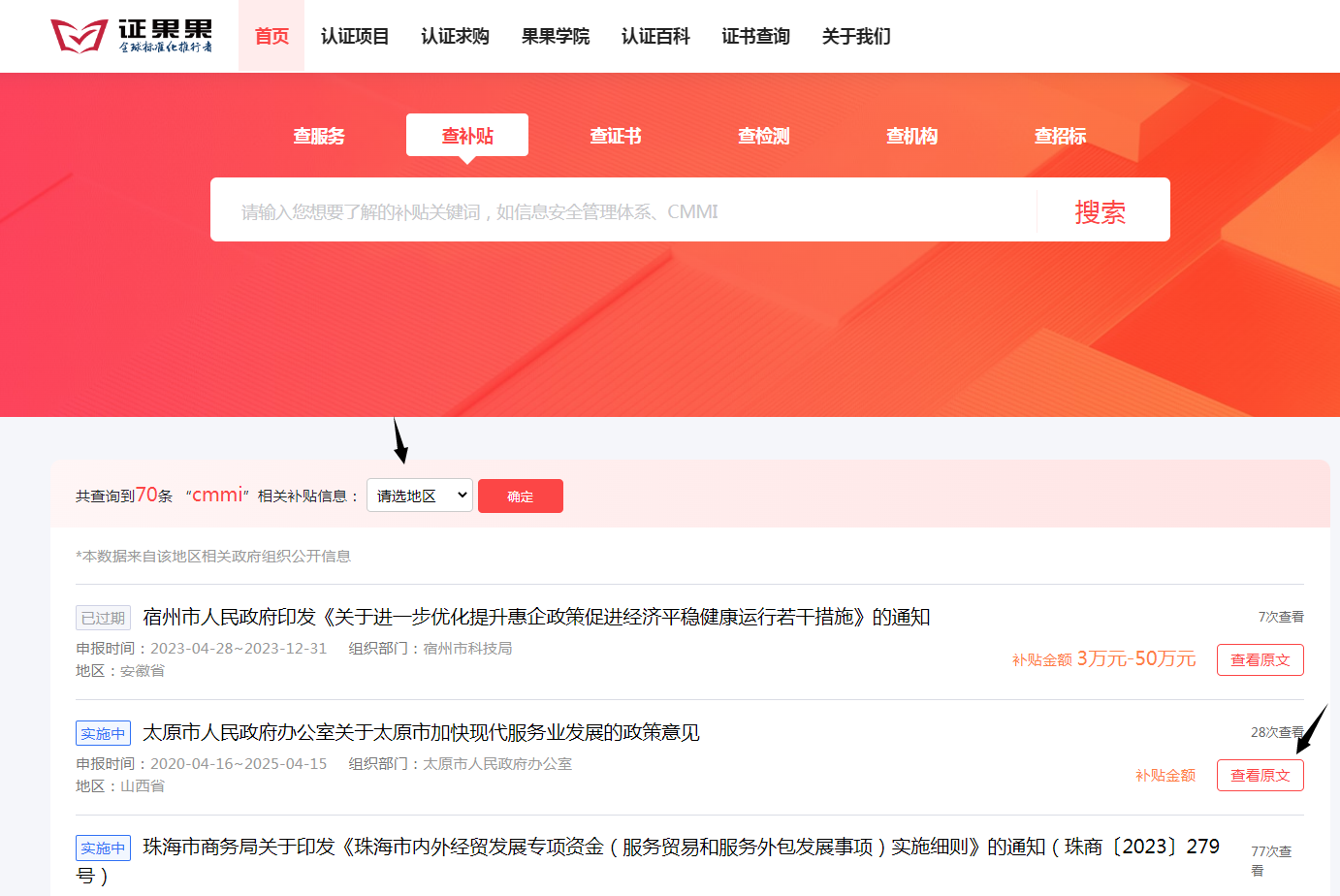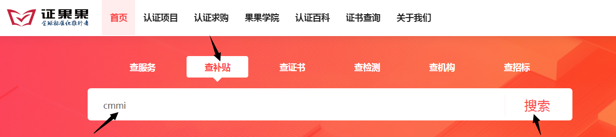 1、打开证果果,在首页找到查补贴,输入想要查询的项目,如“cmmi”,点击搜索。