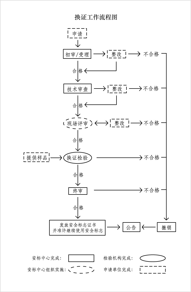 安标中心对受理的换证材料进行技术审查。经技术审查不符合要求的,向申请换证企业发出技术审查整改通知。申请换证的生产企业应在接到整改通知之日起30日内完成整改,逾期未完成整改或整改后仍不符合要求的,终止技术审查并向其发出书面通知。被终止技术审查的生产企业,自被终止技术审查之日起180日内,不得重新申请特种劳动防护用品安全标志。