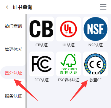 2、左侧选择“国外认证”分类,右侧选择“欧盟CE”点击进入