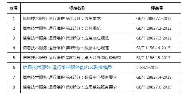 目前ITSS运维服务颁布实施的标准有以下几项: