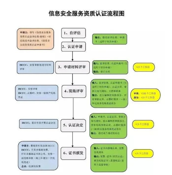认证流程可分为:自评估-认证申请-申请材料评审-现场审核-认证决定-证书颁发-监督审核