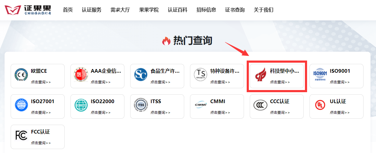 2、然后选择热门认证中的科技型中小企业或者选择资质评定中的科技型中小企业。