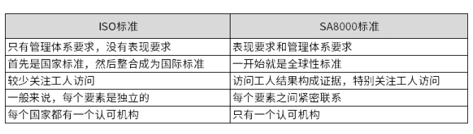 1.不同于ISO标准,SA8000标准同时要求管理体系和表现方面的要求,单有良好的管理体系不足以保证符合SA8000标准。