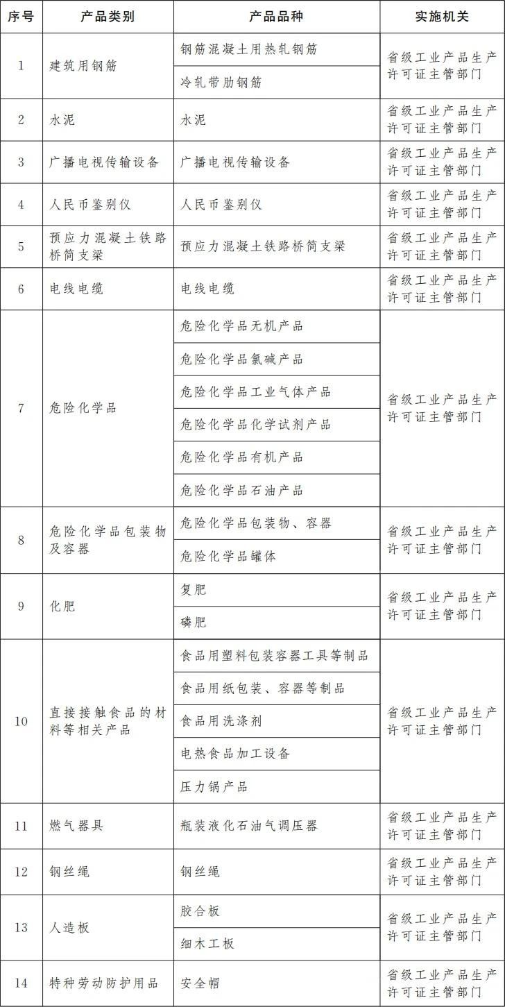 依据《中华人民共和国工业产品生产许可证管理条例》规定,目前实施生产许可证管理的产品目录包含 14类产品,分别是建筑用钢筋、水泥、广播电视传输设备、人民币鉴别仪、预应力混凝土铁路桥简支梁、电线电缆、危险化学品、危险化学品包装物及容器、化肥、直接接触食品的材料、燃气器具、钢丝绳、人造板、特种劳动防护用品等相关产品。