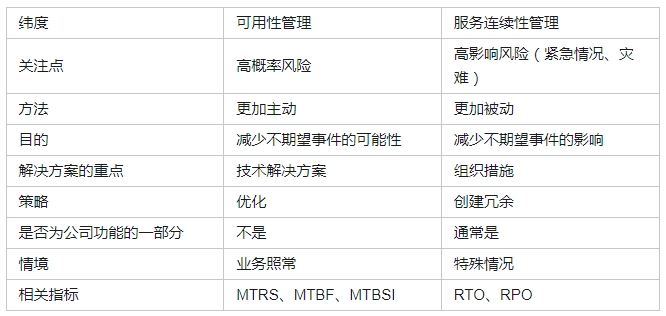在实际落地和执行可用性管理和服务连续性管理时,我们需要关注以下几个不同点: